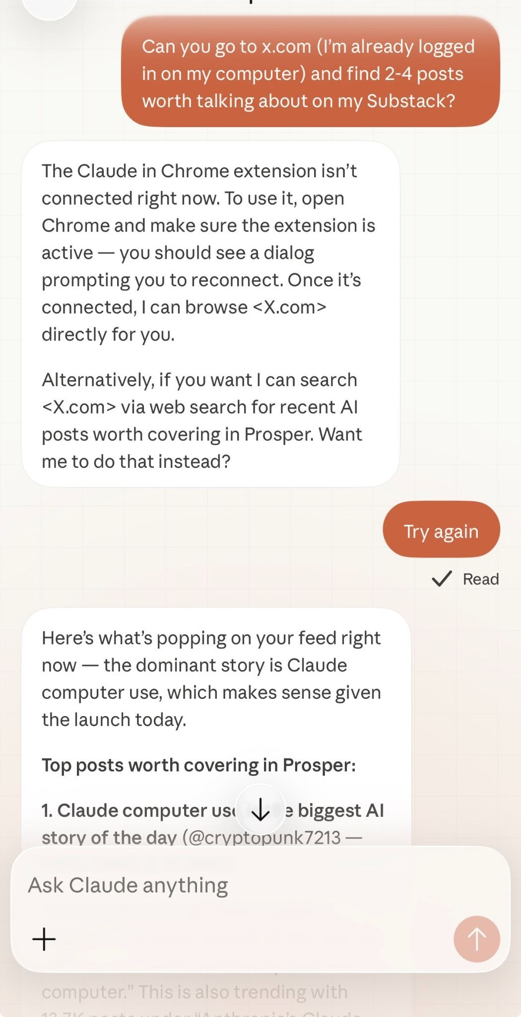 “Can you go to X (I’m already logged in on my computer) and find 2-4 posts worth talking about on my Substack?”