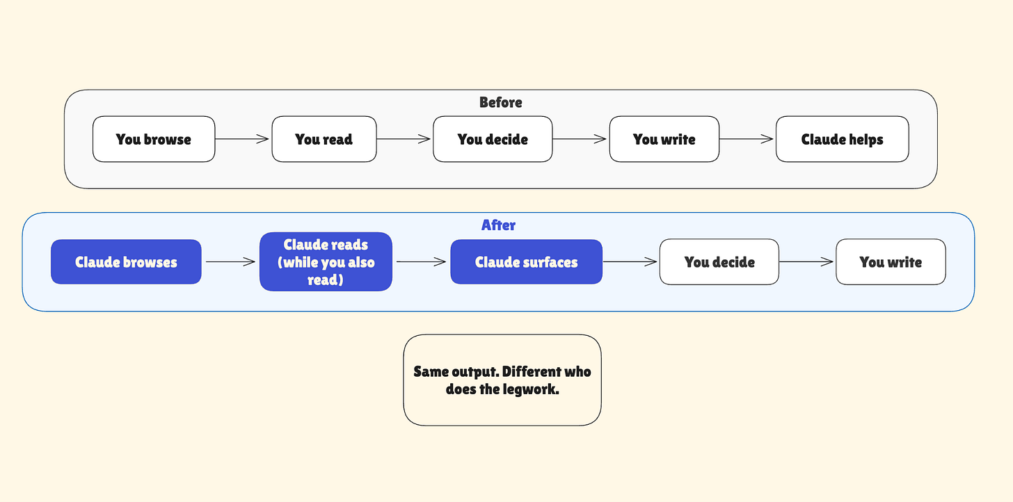 The pre-writing intake problem is a real doozy. I publish daily and the writing isn't what eats the clock. It's the 99 minutes of scrolling before I know what's worth writing about. Having Claude handle that while keeping editorial judgment on my side of the table is the split I've been trying to build with automation. (With mixed results. Mostly mixed. Fine, mostly bad. But educational.)