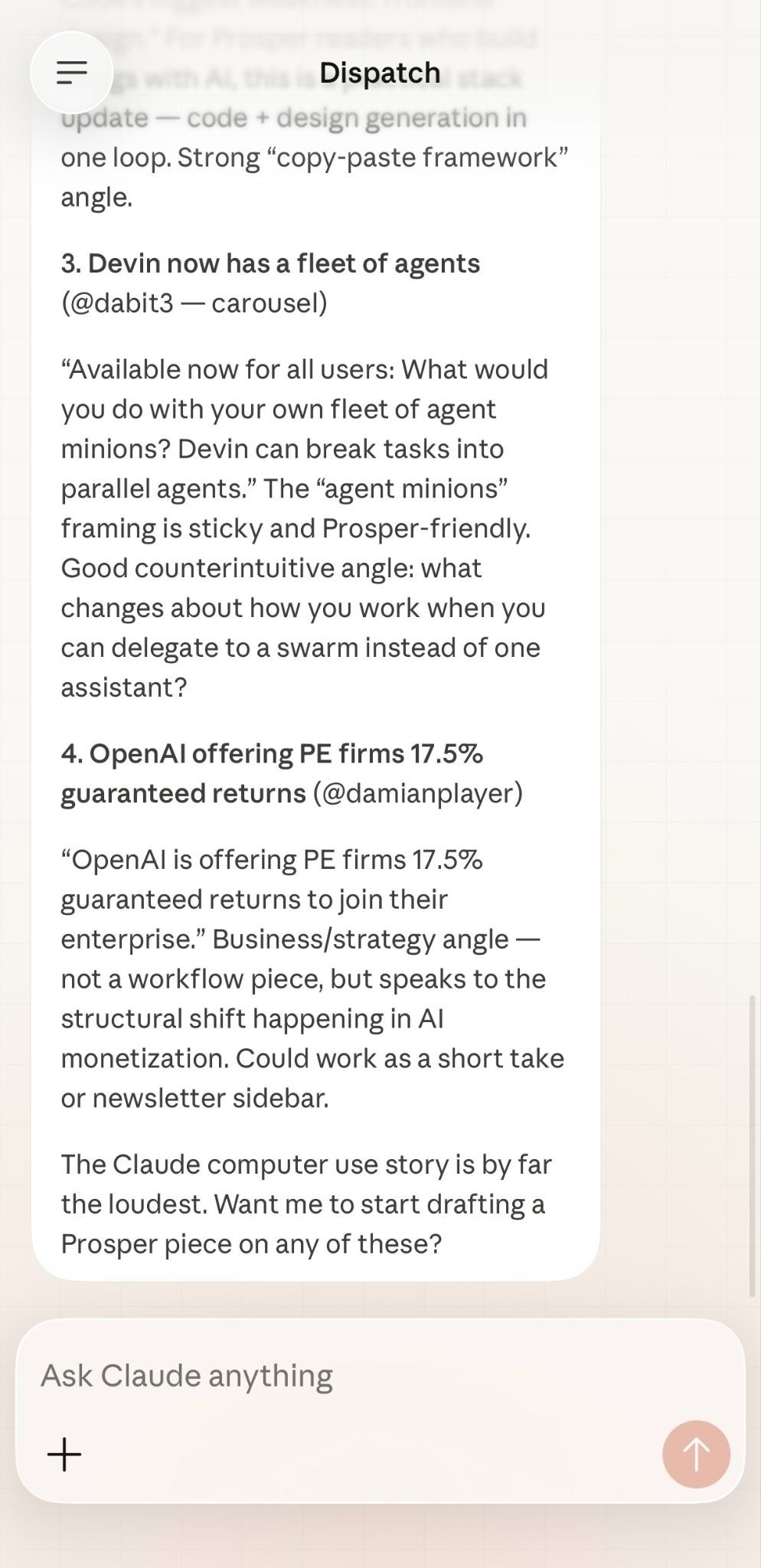 For each one, it wrote a one-sentence editorial angle calibrated to Prosper specifically, looked pretty nice. I am assuming it checked the memory for what I write about and that’s how it gave me the angle.