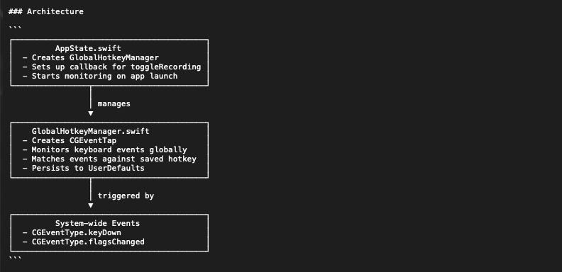 ”We just finished implementing [feature]. Document the file structure, approach, and conventions in CLAUDE.md.”Here’s what Claude wrote in my project after we finished building a global hotkey system: