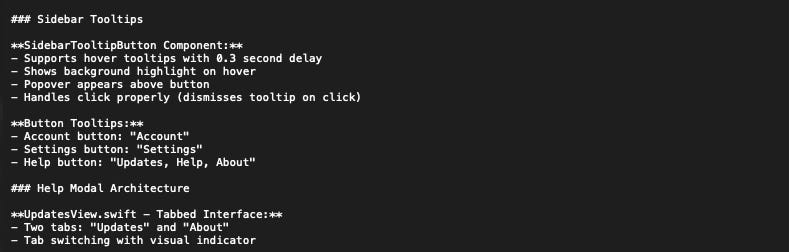 - Storage: UserDefaults key “GlobalHotkey”5 lines. That took Claude about 15 seconds to write. The next session, when I needed to add a new keyboard shortcut, Claude already knew the architecture — which file handled what, which approach we’d chosen and why, and the edge case with modifier-only keys. Zero re-explaining.