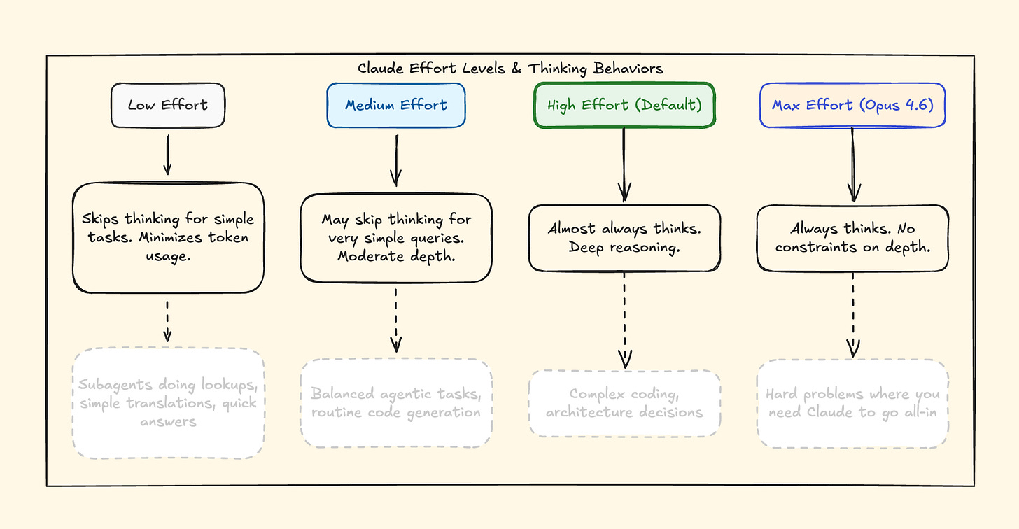 Here’s what most explanations get wrong: this isn’t just a cost optimization tool. It’s a behavioral dial. At `low` effort, Claude makes fewer tool calls, skips preamble, and moves fast. At `max`, Claude thinks with no constraints — deepest analysis, most thorough reasoning. `max` is exclusive to Opus 6.